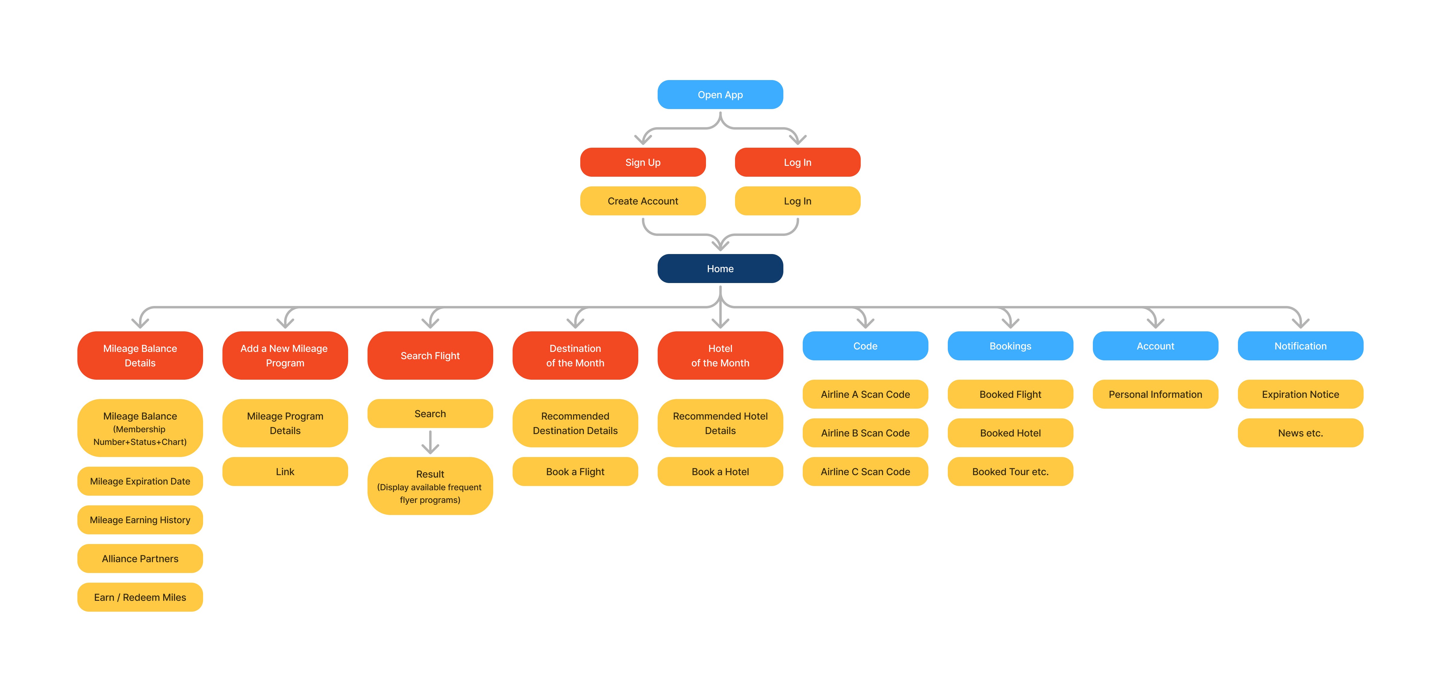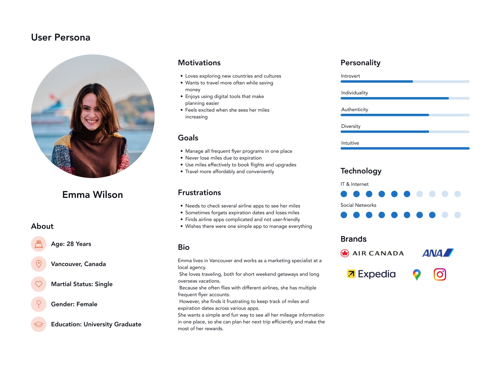To create a clear and enjoyable user experience, I started by researching how people currently manage their mileage programs. I analyzed existing airline apps and interviewed users to understand their pain points. Based on these insights, I developed a strategy focused on simplifying the process and making it more engaging.